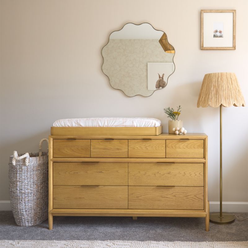 Reposant sur un socle en laiton brossé, notre lampadaire Greta en raphia festonné, mêlant différents matériaux, apporte une élégance aérienne à la chambre, à la chambre d'enfant ou à la salle de jeux. Son abat-jour festonné, inspiré d'une fleur, est tissé en raphia naturel et diffuse une lumière douce, idéale pour accompagner les devoirs ou l'heure du conte.