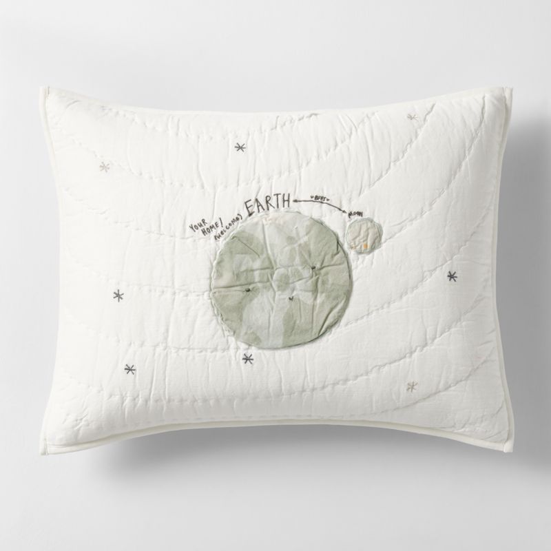 Envie de rendre l'heure du coucher plus amusante pour vos enfants ? Habillez leur lit d'une parure de lit ludique qui reflète leurs passions. Notre taie d'oreiller « Espace » donne vie à la planète Terre grâce à un appliqué amusant et des détails brodés, d'un adorable petit visage à une anecdote amusante écrite à la main. Et le coton biologique ultra-doux assure confort et douceur aux tout-petits. Associez-la à notre parure de lit et couette « Espace » en coton biologique assortie pour un style intergalactique.