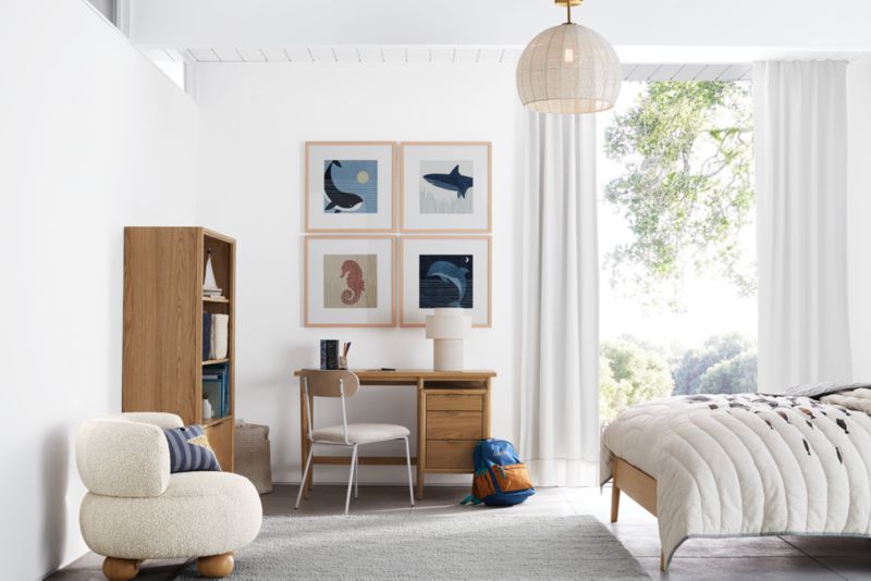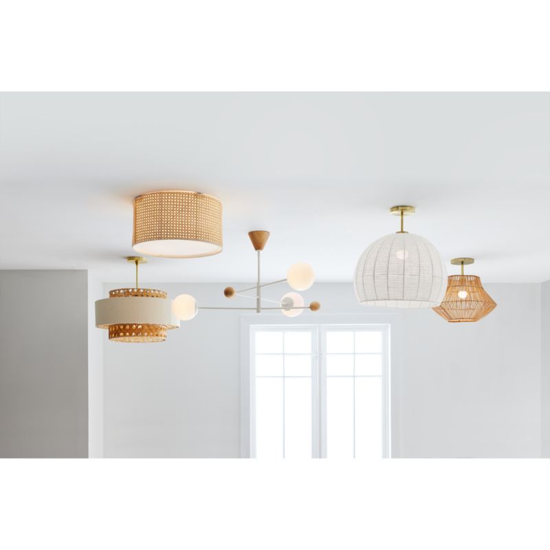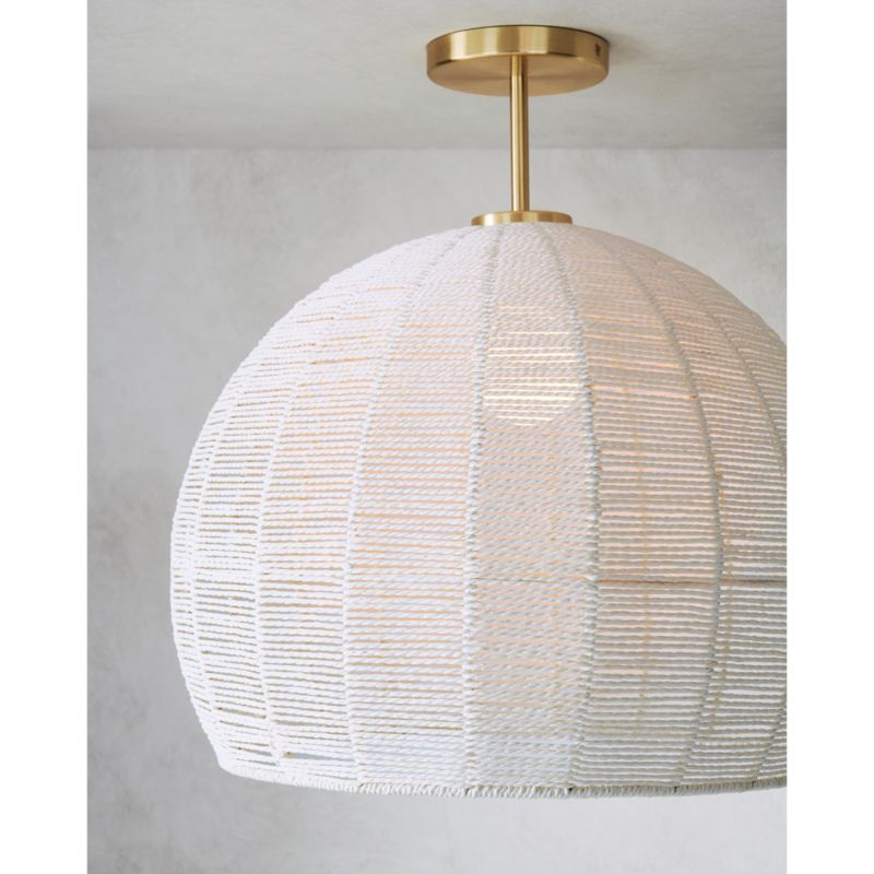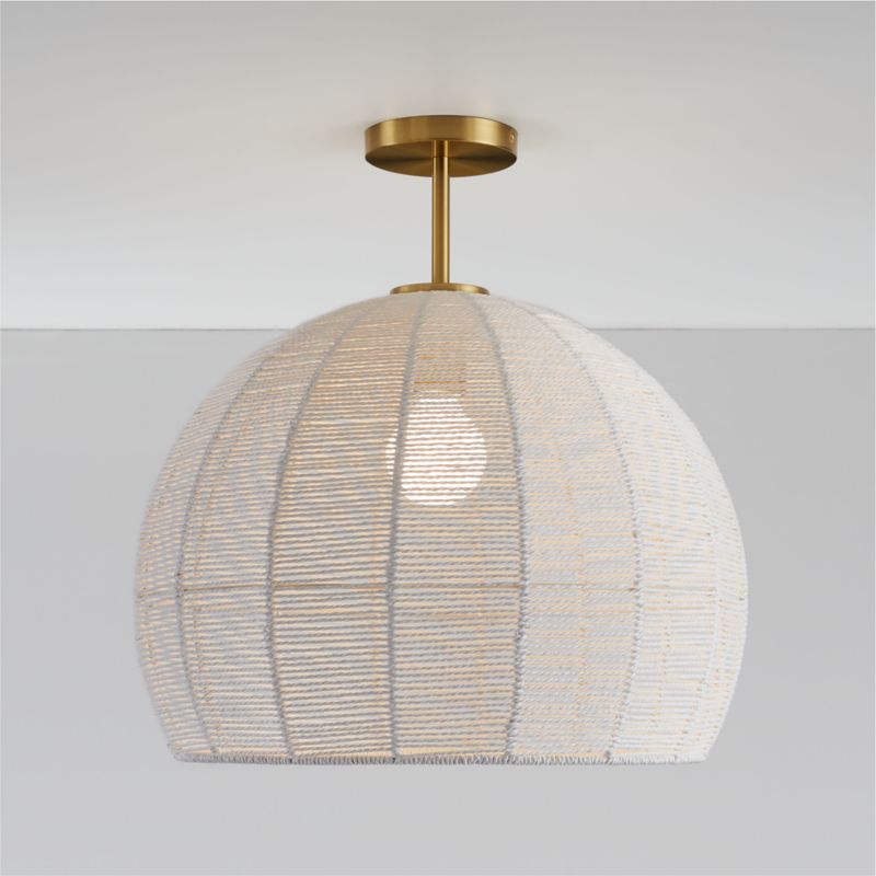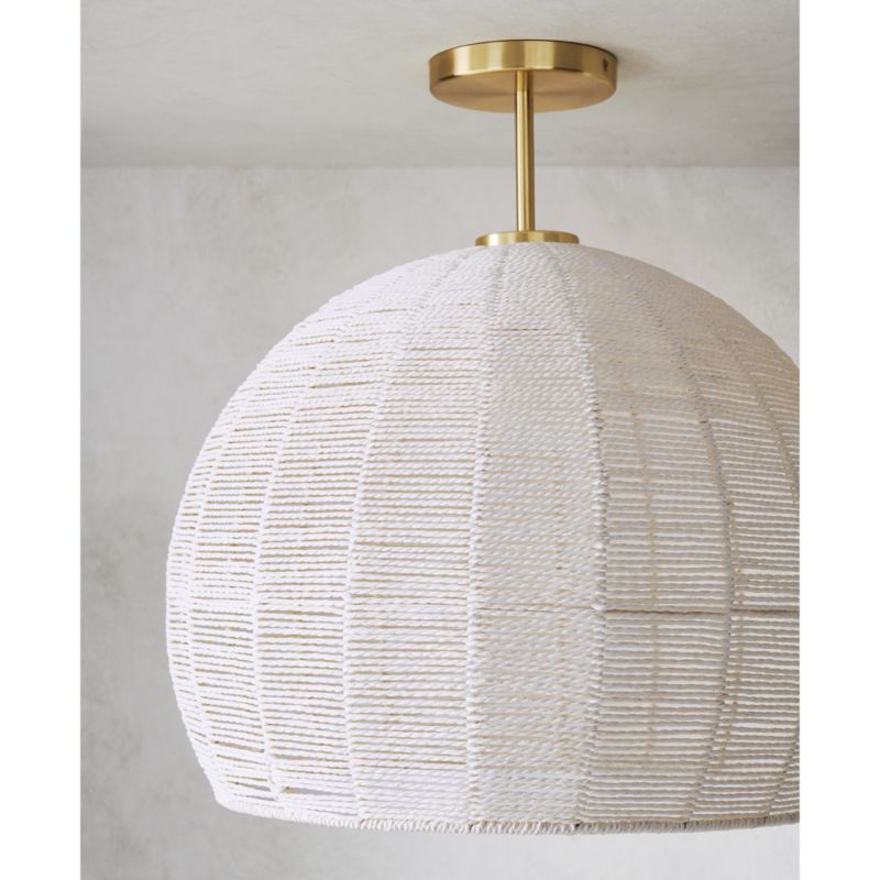 Moderne et aérienne, notre suspension encastrée diffuse une lumière douce et apaisante. Suspendue à une courte tige en laiton, elle met en valeur une sphère ouverte tressée de corde en papier ivoire. À la fois contemporaine et classique, elle illumine avec élégance et discrétion les chambres d'enfants.