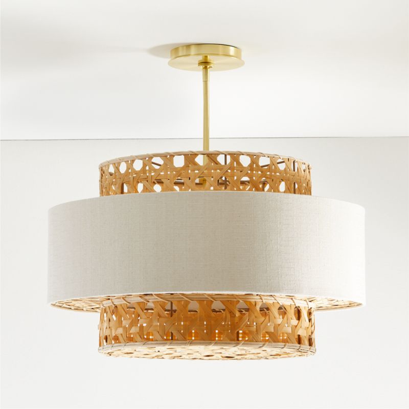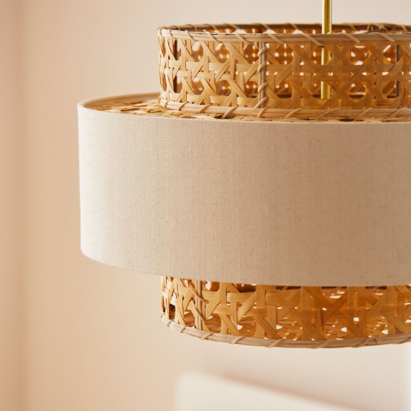 - Cadre en rotin naturel avec abat-jour en lin, tige et plaque de plafond en laiton