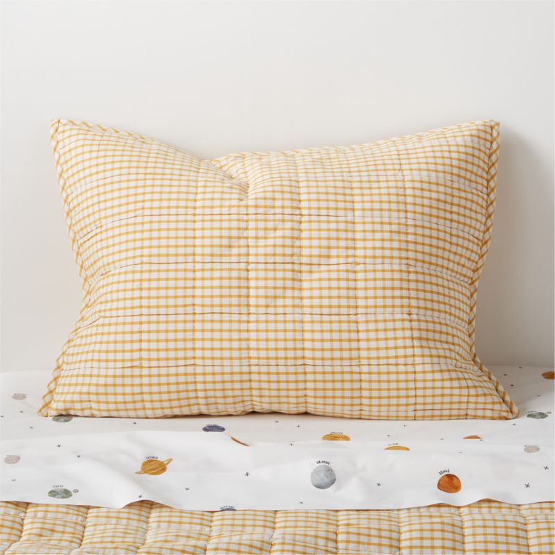 Nous avons réinterprété le motif à carreaux emblématique pour que les enfants puissent orner leur lit d'un motif simple et ludique, dans une couleur apaisante et facile à vivre, qui s'harmonise avec toutes nos collections de linge de lit enfant. Confectionnée en voile de coton biologique ultra-doux teint en fil et finie avec un matelassage à la main, cette couverture à petits carreaux est réversible et présente un côté uni jaune, offrant ainsi deux styles en un. Associez-la à notre couette en coton à carreaux jaunes assortie pour un ensemble harmonieux.